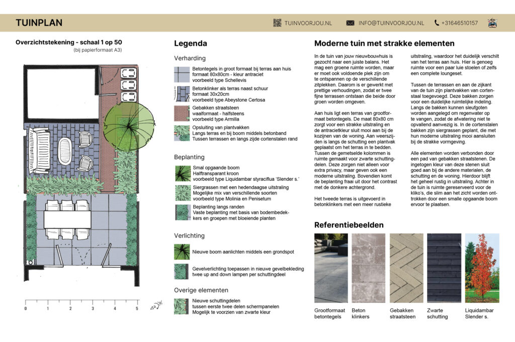 Dit samenhangende ontwerp verbeeld ik samen met een legenda, referentiebeelden en een planomschrijving op een poster. Middels een indicatie van de materialisatie en beplanting wordt een voorstelling gemaakt van de toekomstige sfeer van de tuin. Zo wordt alles in één beeld samengevat.